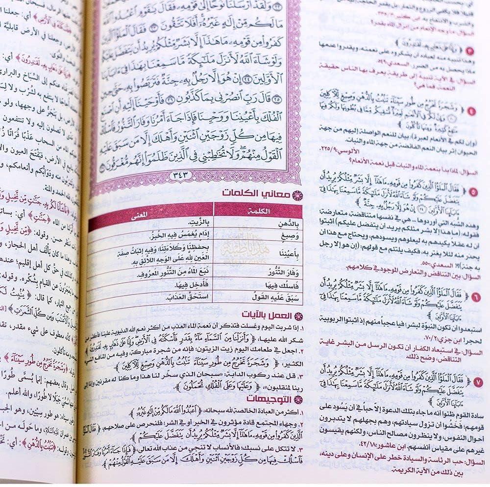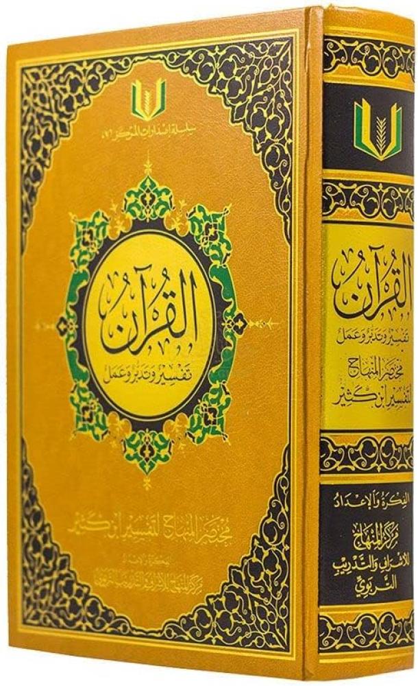 كل وجه من المصحف له صفحة من كتاب "القرآن تدبر و عمل" و يقابله صفحة من "مختصر المنهاج لتفسير ابن كثير" و هو اختصار و تنقيح لكتاب "عمدة التفسير عن الحافظ ابن كثير" للشيخ أحمد شاكر