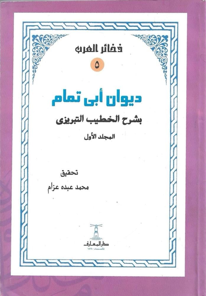 ديوان أبي تمام بشرح الخطيب التبريزي تحقيق محمد عبده عزام، ديوان شعري رائع، شعر مصنوع من مادة الحنين، قصائد عنيدة تتشبث بالماضى الذى يضنى كاتبها وشاعر يؤثر وهم الماضى على زيف الواقع ! ديوان ينبض بعبق تاريخ الشعر، بما يحمل من روائع التبريزي.