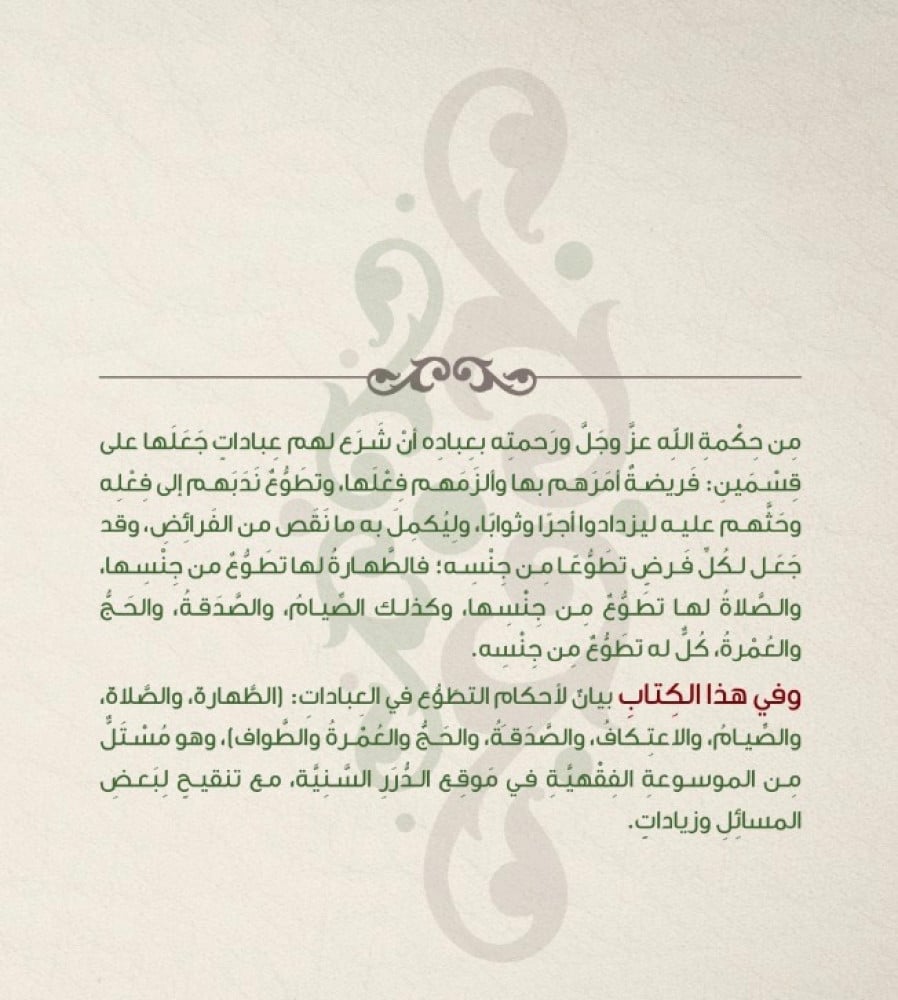وفي هذا الكِتابِ بيانٌ لأحكامِ التطَوُّعِ في العِباداتِ: (الطَّهارةُ، والصَّلاةُ، والصِّيامُ، والاعتِكافُ، والصَّدَقةُ، والحَجُّ والعُمْرةُ والطَّواف)، وهو مُسْتَلٌّ مِن كِتابِ «فِقْهُ العِباداتِ» مِن الموسوعةِ الفِقْهيَّةِ، مع تنقيحٍ لِبَعضِ المسائِلِ وزياداتٍ