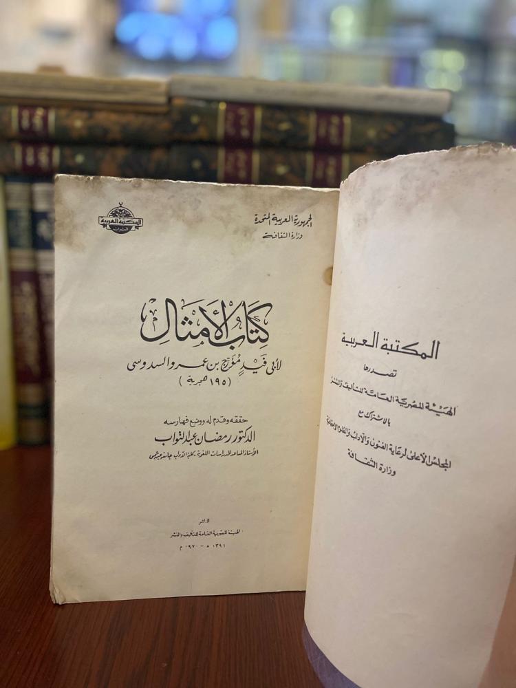 وكتاب الأمثال، المؤرج السدوسي، الذي ننشره اليوم لأول مرة، يعد من أقدم كتب الأمثال العربية، التي عنى بجمعها الرعيل الأول من اللغويين العرب، وتناولوها بالشرح والتفسير وقد عرفت هذا الكتاب من اقتباسات منه في خزانة الأدب للبغدادي، حين طالعتها منذ أعوام خلتظ، وحين رجعت إلى كتاب بروكلمان في تاريخ الأدب العربي، عرفت أن من كتاب المؤرج نسخة وحيدة محفوظة بمكتبة دير الإسكوريال بأسبانيا، فأسرعت إلى اجتلاب مصورة منها، وبذلت من جهدي ووقتي في قراءتها، والتعليق عليها، وشرح ما غمض من عباراتها، وتوثيق نصوصها بعرضها على مختلف المصادر، وظللت عشر سنوات أنقب عما فيها من شعر في بطون المراجع، غير أن بعضه لا يزال عزيز المنال، بعيد المرام.