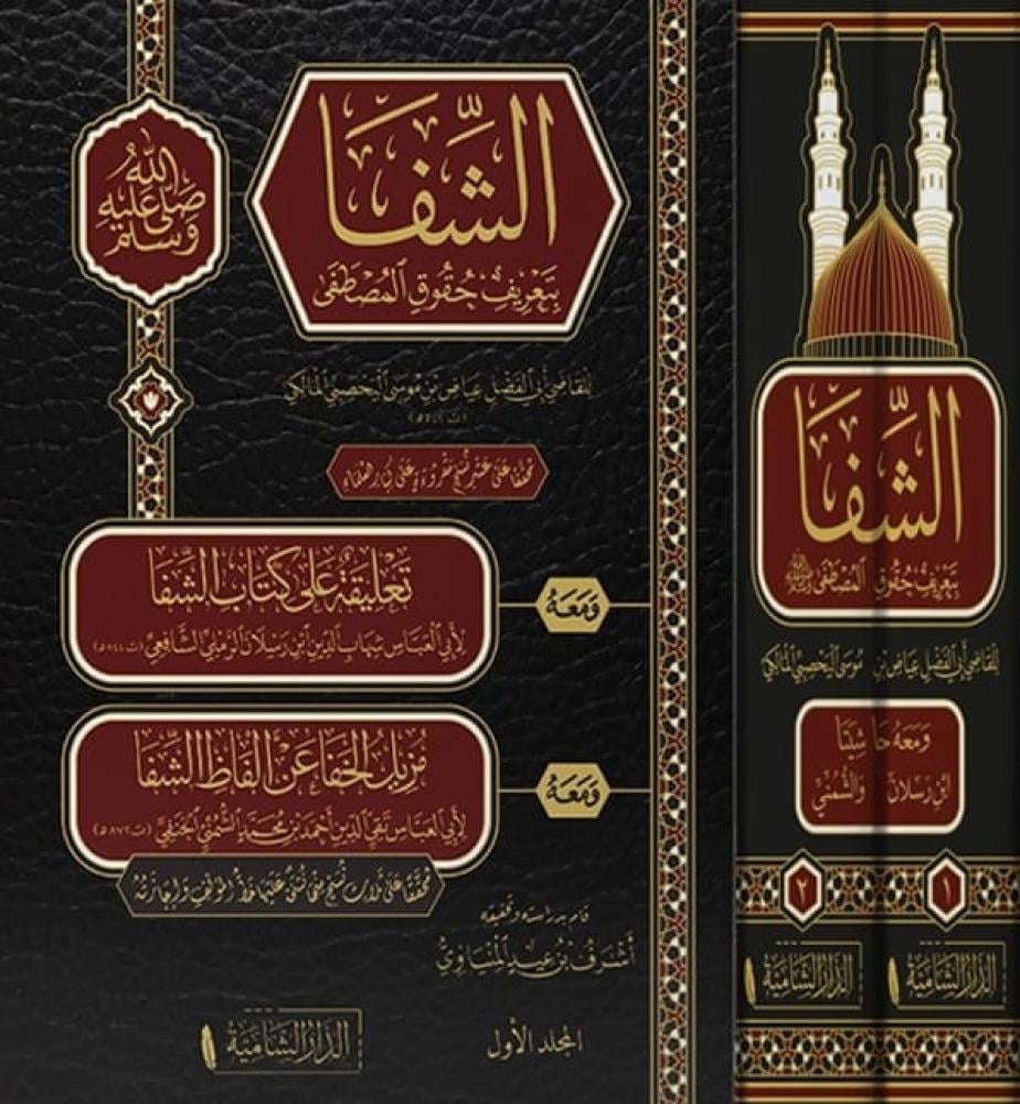 كتاب في الفضائل ومناقب النبي ﷺ، وهو من أجل الكتب في موضوعه كيف لا وقد كتبه شيخ المتقين وسيد الورعين والمحبين للنبي صلى الله عليه وسلم القاضي أبو الفضل عياض، فقد جمع فيه كل شمائل النبي ﷺ وأوصافه وما يجب في حقه ولعله لم يغفل شيئا يتعلق بحضرته ﷺ من قريب أو بعيد لذا سماه الشفا.