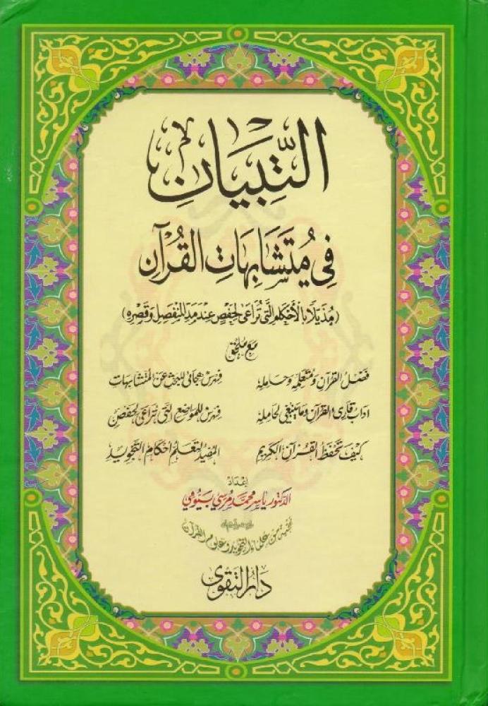 يعد كتاب “مصحف التبيان في متشابهات القرآن مذيلًا بالأحكام” من تأليف المحقق ياسر محمد مرسي بيومي، وهو كتاب ملون يتم نشره عن طريق دار التقوى للطبع والنشر والتوزيع. يحتوي هذا الكتاب على جميع الآيات التي يتعذر على الحفاظ على ترتيبها في القرآن المصحفي بسبب التشابه بينها، والتي قد يتم تسميعها بشكل خاطئ بدون النظر في المصحف. وقد قام المؤلف بجمع جميع هذه الآيات المتشابهة في كل موضع في القرآن، مع إضافة الأحكام اللازمة لكل آية من هذه الآيات.