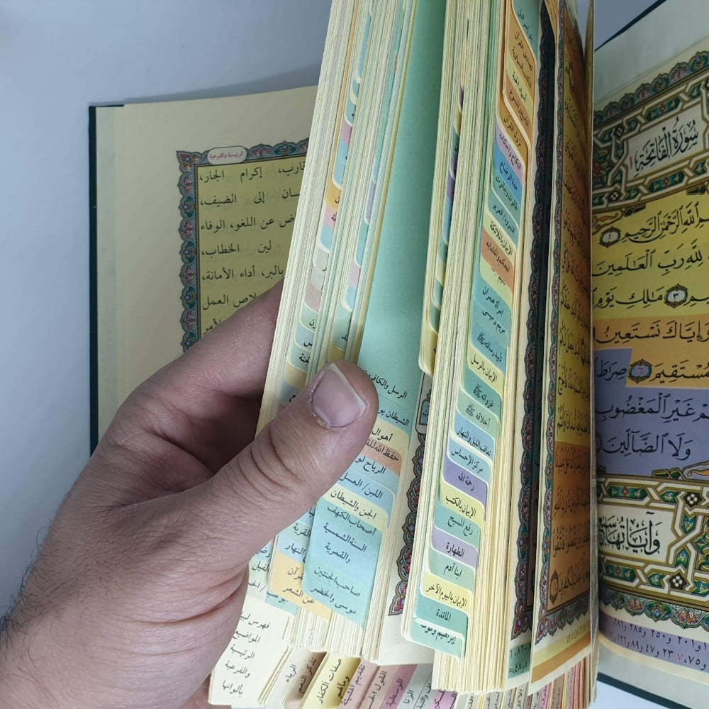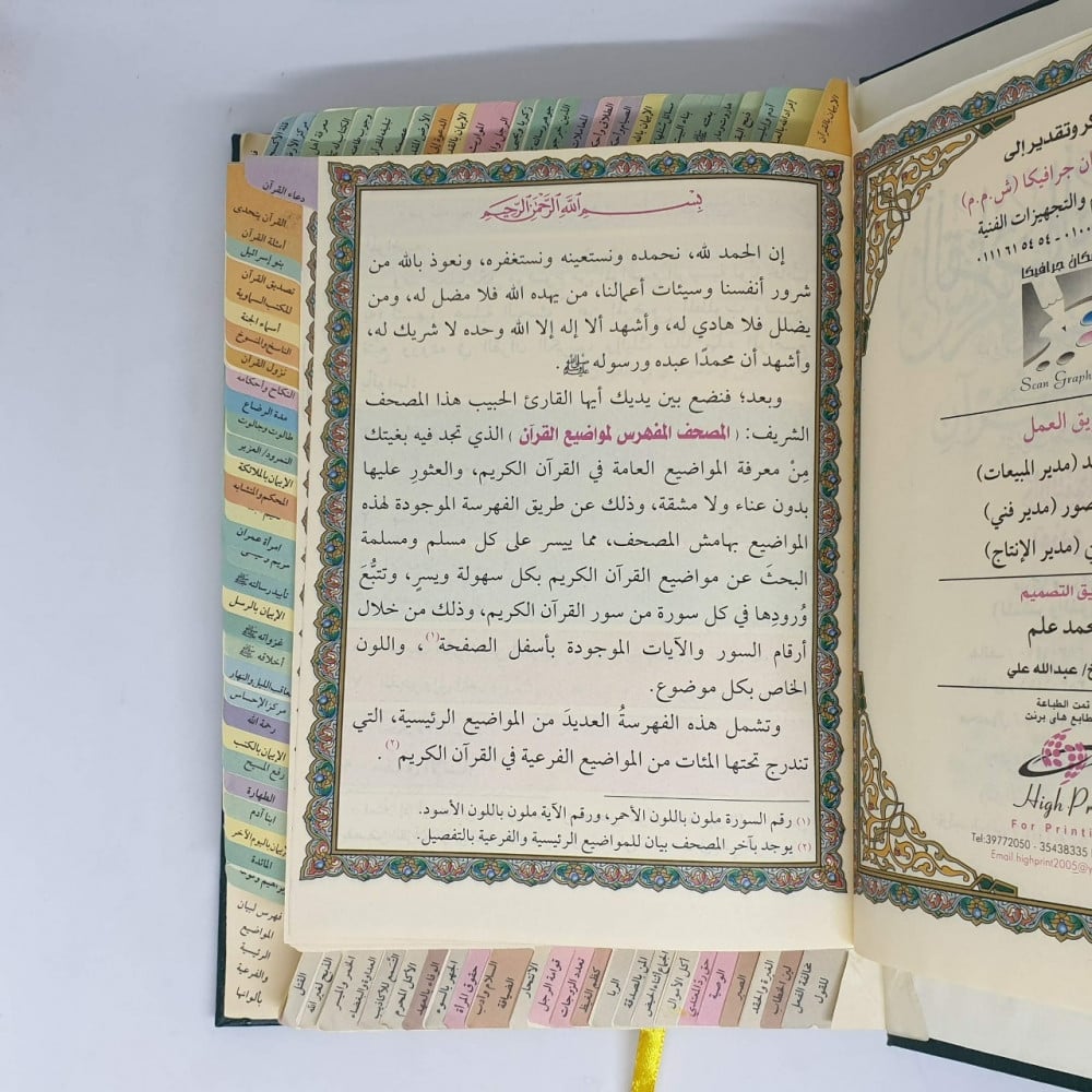 ملحوظة : أرقام الآيات الخاصة بالموضوع الموجود بالفهرسة مثبتة داخل برواز المصحف باللون الأحمر ، وأرضيتها ملونة بلون الموضوع .